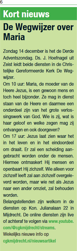 Lees hier het artikel voor de diensten van 14 dec. In De Groene Venen is het artikel geplaatst.