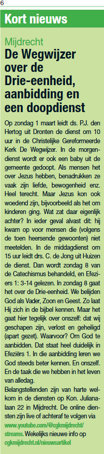 Lees hier het artikel voor de diensten van 15 feb. In De Groene Venen is het artikel geplaatst.