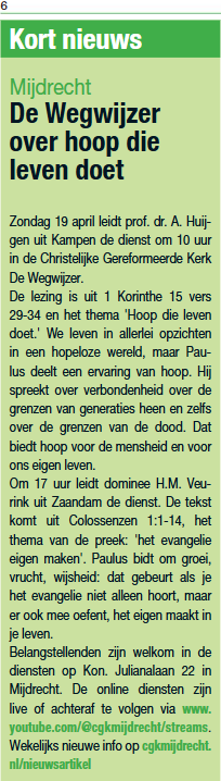 Lees hier het artikel voor de diensten van 12 apr. In De Groene Venen is het artikel geplaatst.
