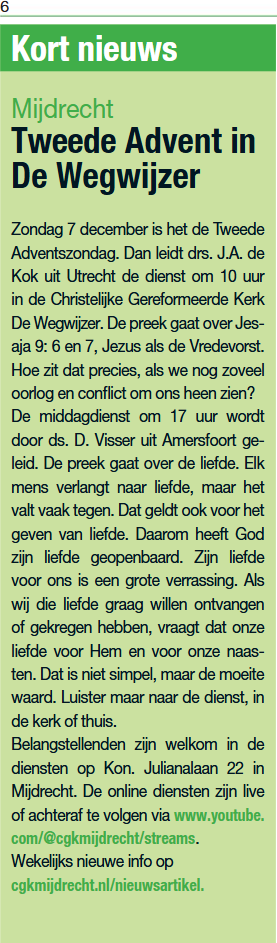 Lees hier het artikel voor de diensten van 7 dec. In De Groene Venen is het artikel geplaatst.